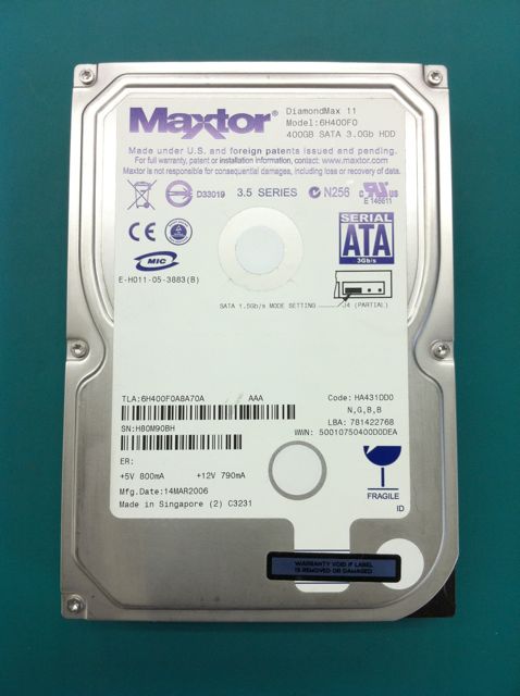 診断の結果は、HDD(ハードディスク)故障です。HDDをとりだしたところ、Apple純正品ではないMaxtor製品が搭載されていました(だから壊れたというわけではありません)。お客様によると中古で譲り受けたMacだとのことなので納得です。