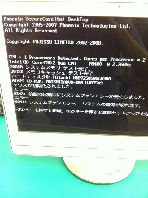 電源を入れると「0242: 前回の起動中にシステムファンエラーが発生しました。0241:システムファンエラー。システムの電源が切れます。」などと表示され先に進まないという状態です。