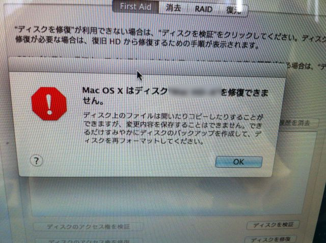 診断中、内蔵HDD(ハードディスク)を作業用のMACに接続したところ↓のようなメッセージが表示されました。