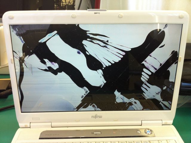 故障症状はご覧の通りです。液晶パネルが割れてしまい、何もすることができません・・・。