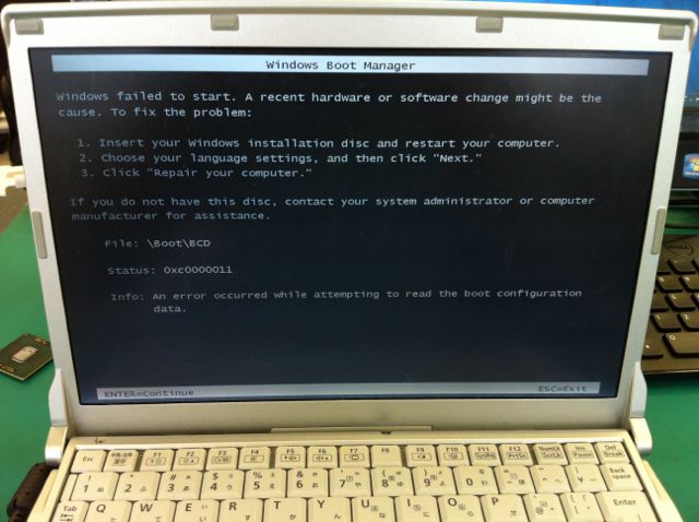 故障状態は「電源を入れるとBCD関連の0xc0000011エラーで先に進まない」というもの。